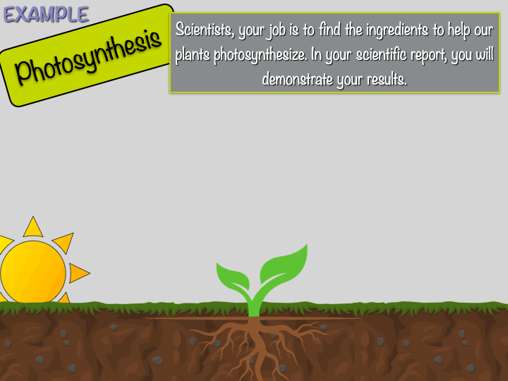 "Scientists, your job is to find the ingredients to help our plants photosynthesize. In your scientific report, you will demonstrate your results."