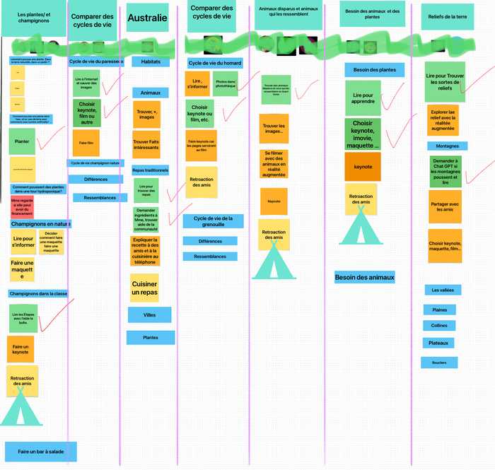 À la fin de chaque session de travail, nous regardons ensemble nos listes et chaque groupe dit ce qu’il a fait (et coche) et identifie la priorité du prochain cours en changeant la couleur du pense-bête à orange. Ils ajoutent aussi des étapes régulièrement.
