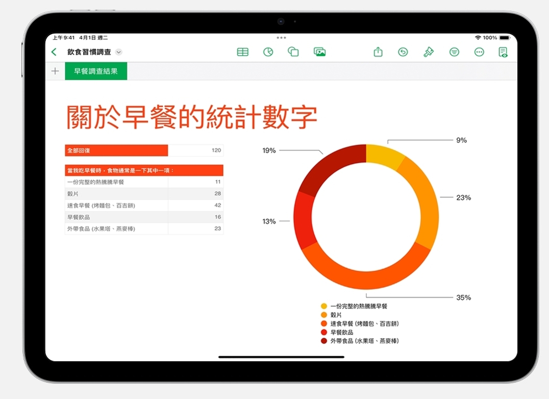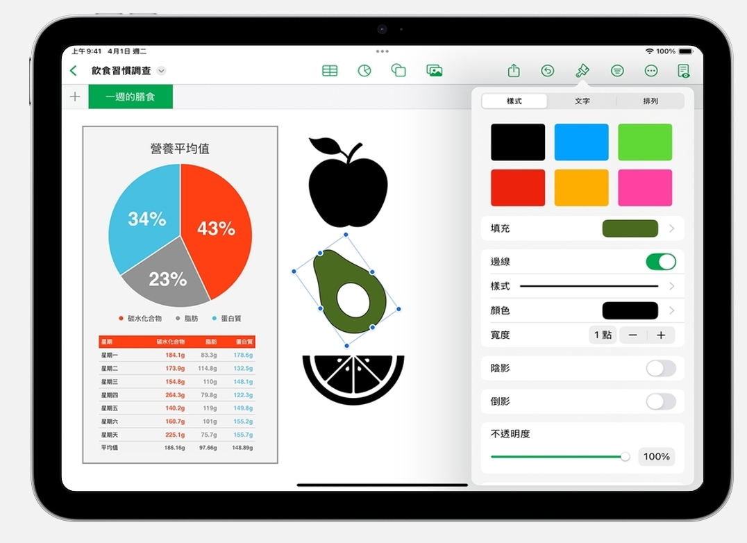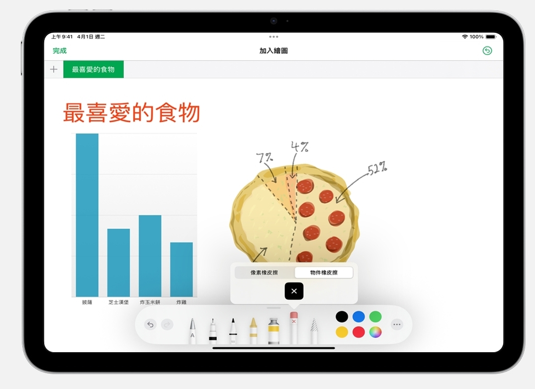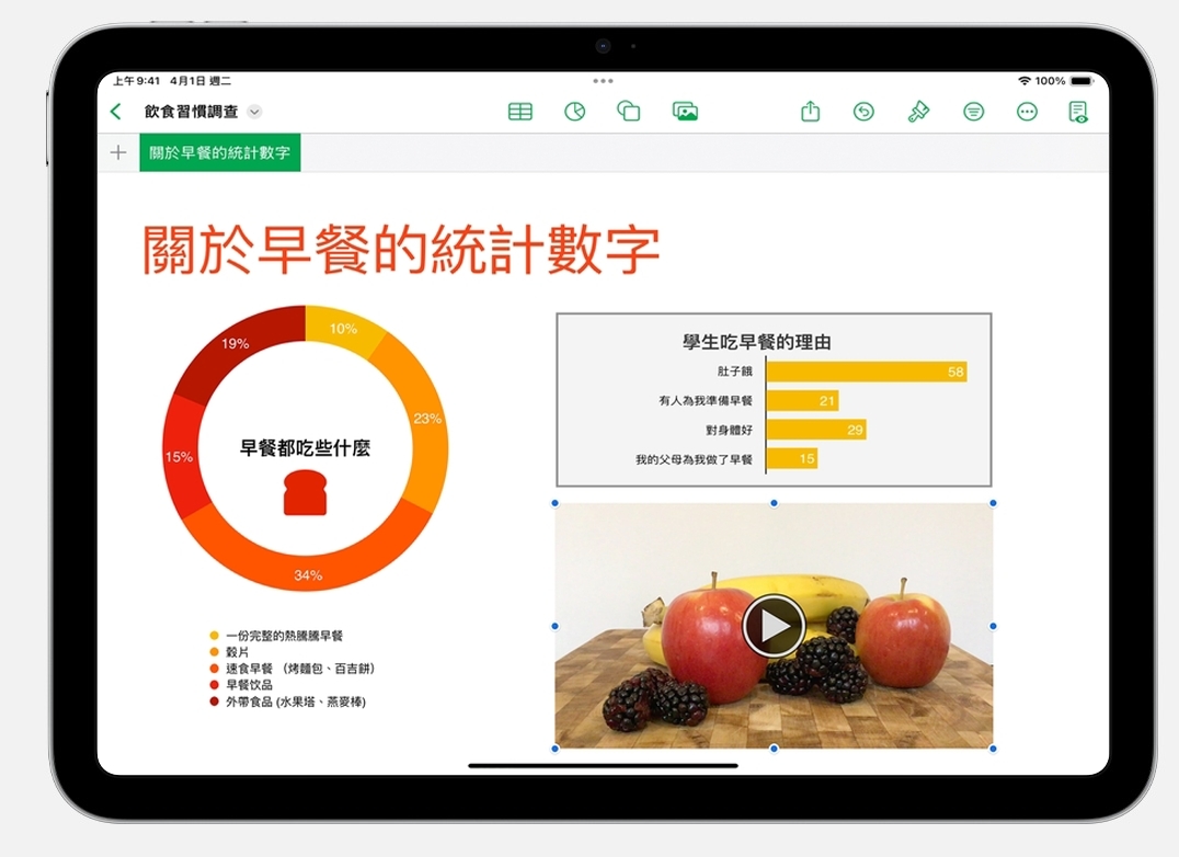 你可以利用 Numbers 製作精美的試算表,並加入出色的表格和影像。你甚至可以使用 Apple Pencil 在 iPad 上加入圖解和色彩繽紛的插圖,讓圖表與資料更加豐富。