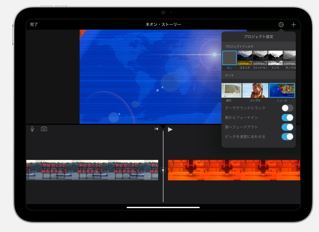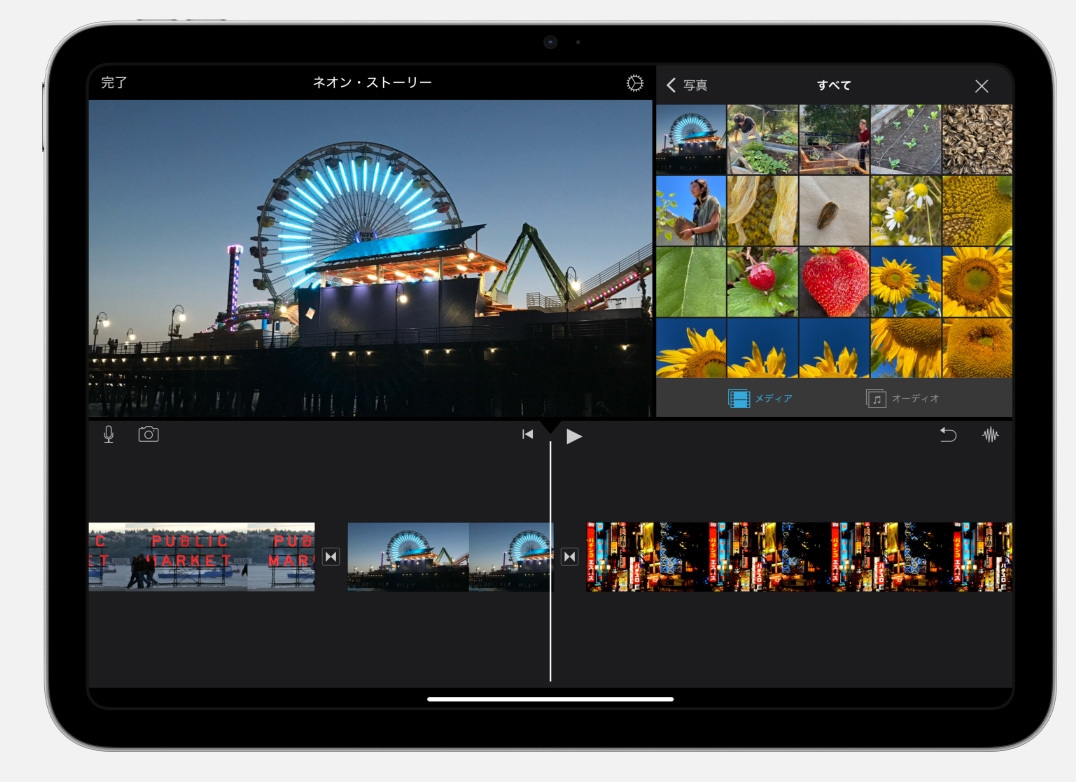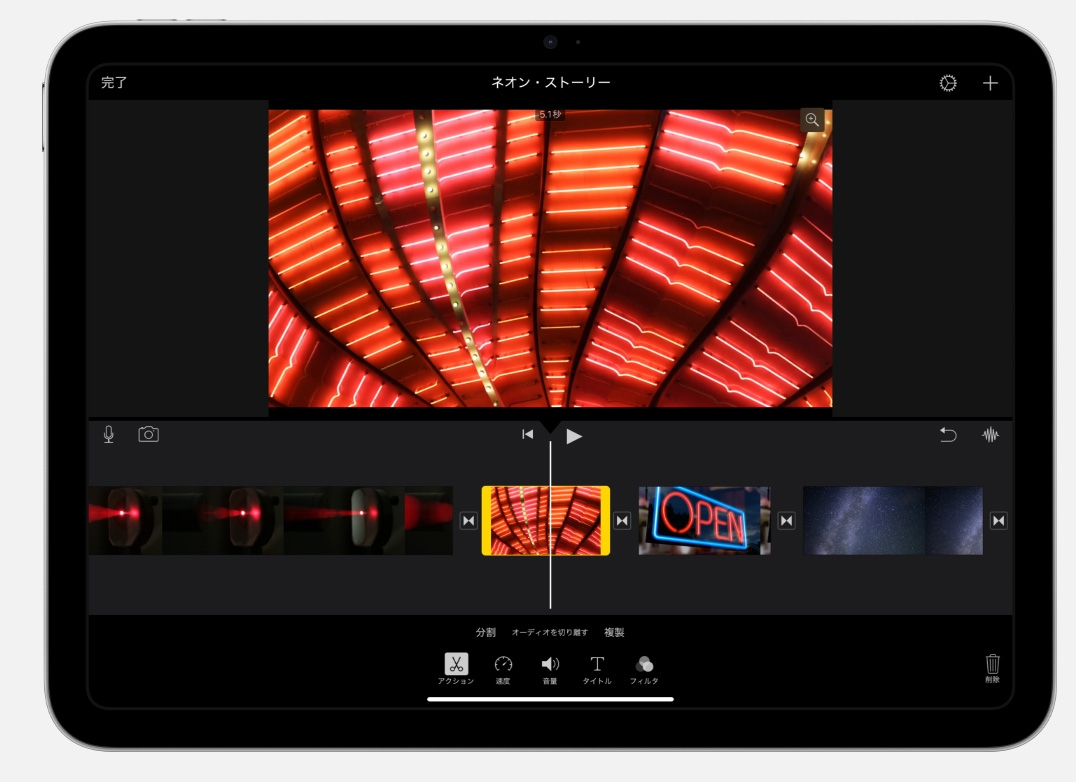 自分のiPadで撮影したビデオや写真を使い、タイトル、音楽、エフェクトなどを追加してムービーを作ることができます。新しい授業の紹介、歴史的な出来事の再現、実験手順のデモ、地域イベントの記録など、様々なテーマのムービーを作って生徒たちと共有しましょう。
