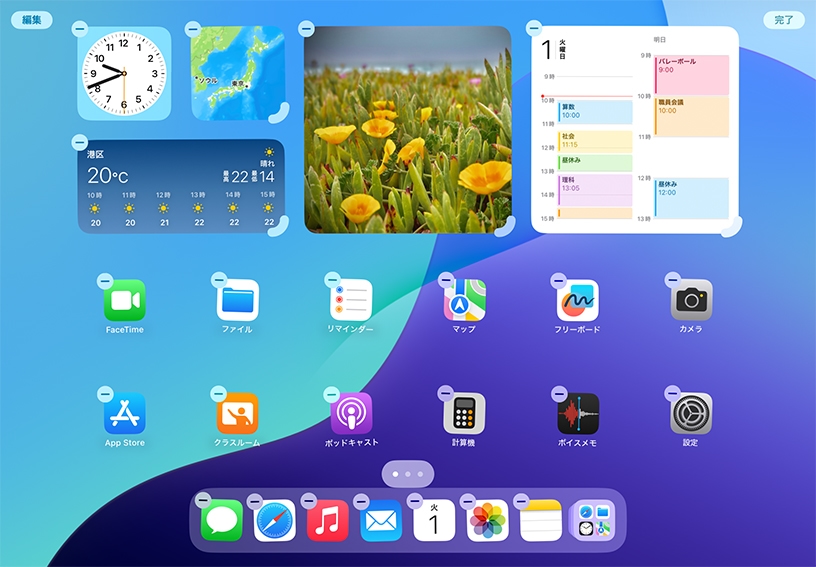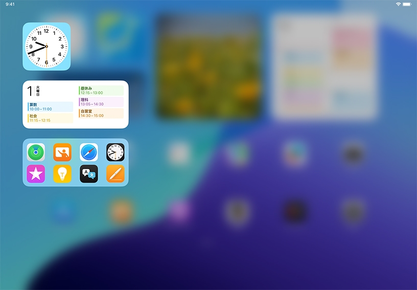 ホーム画面には、iPadにあるアプリが並んで表示されます。ホーム画面からiPadの中を検索することもできます。授業の内容に関連するアプリやウェブサイトをはじめ、特定の連絡先やメッセージがすぐに見つかります。
