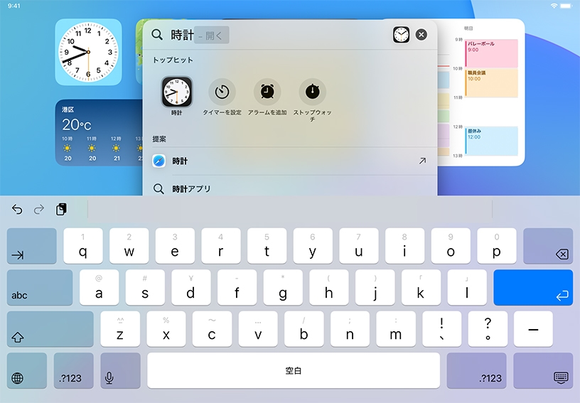 検索機能を使ってみましょう。ホーム画面の中央から下にスワイプして「時計」と入力し、検索結果に表示された時計アプリ