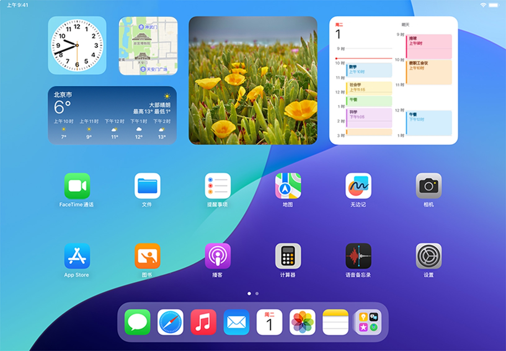 主屏幕是 iPad 上所有 app 的集中展示区域。在主屏幕上,你还可以快速搜索 iPad,以查找与学习主题相关的推荐 app 或网站,或者查找联系人、信息等更多内容。
