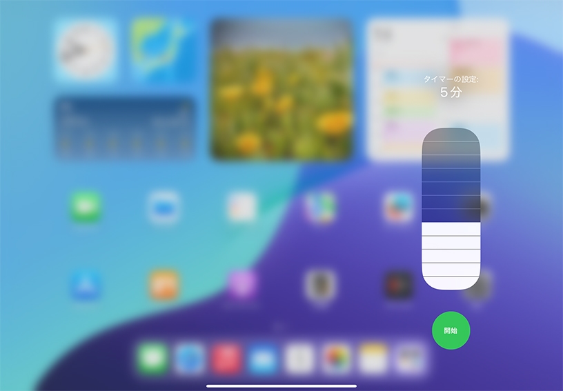 タイマーをセットしてみましょう。タイマーボタンを長押しします。スライダを上または下にドラッグして時間の長さを設定し、「開始」をタップします。
