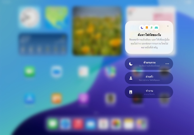 ปิดเสียงการแจ้งเตือนและการโทรชั่วคราว โดยแตะ "โฟกัส" แล้วแตะ "ห้ามรบกวน" จากนั้นแตะ "ห้ามรบกวน"