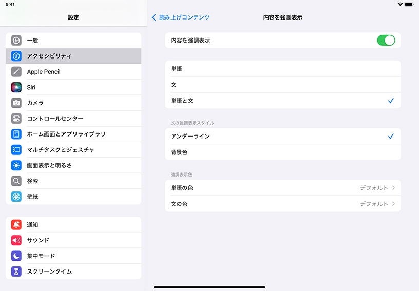 スピーチの設定をいくつか有効にしてみましょう。「読み上げコンテンツ」をタップし、「選択項目の読み上げ」と「画面の読み上げ」をオンにしてください。さらに、「内容を強調表示」をタップしてオンにしてみましょう。