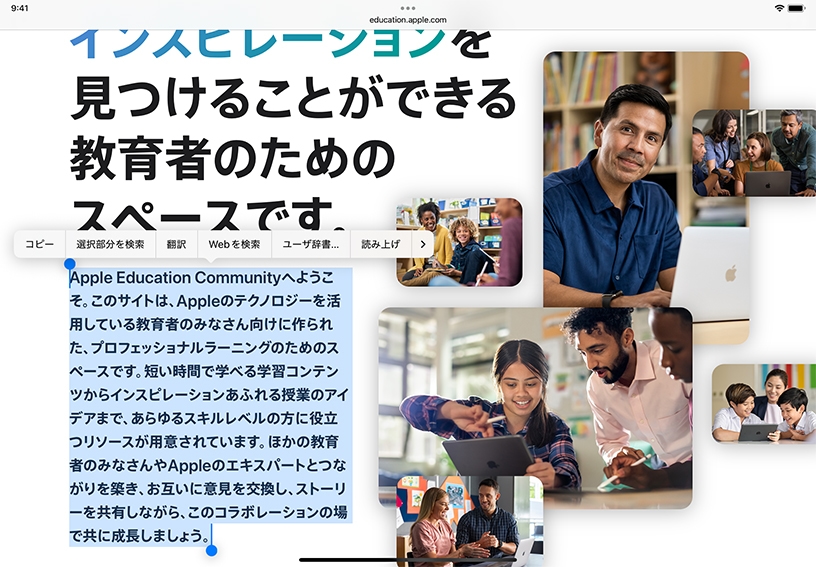 選択したテキストをiPadに読み上げてもらいましょう。Safariでウェブページを開くか、Pagesで文書を開いて、テキストを選択し、「読み上げ」をタップします。