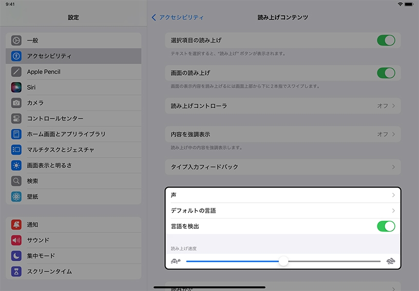 「設定」に戻って、読み上げ速度を調節したり、別の声を選択したりしてみましょう。