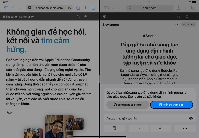 , sau đó chạm vào Hiển Thị Trình Đọc để xem phiên bản giản lược của trang Apple Education.