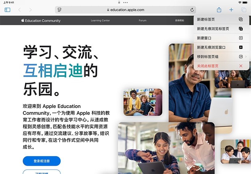 在 iPad 上打开这个指南,同时浏览另一个网页。轻触并按住这个链接,然后轻点“新建窗口”进行分屏,并在另一个浏览器窗口中查看 Apple Education 新闻文章。