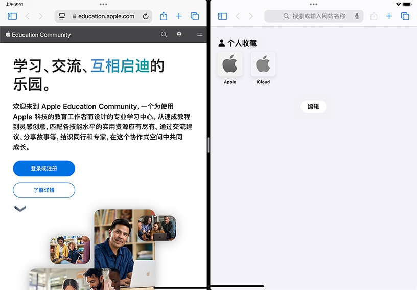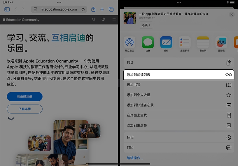 你可以使用 Safari 浏览器在网上发现、存储和分享各类学习资源。同时,还可并排查看网页,方便你整理想要阅读的文章列表,并隐藏干扰注意力的元素,让你和学生能够全身心聚焦于关键内容。