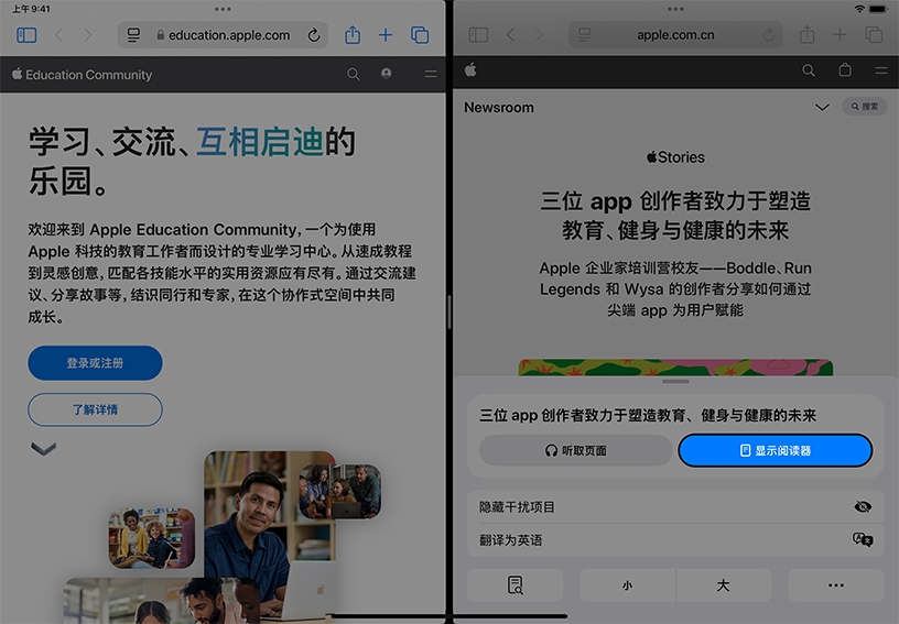 ,然后轻点“显示阅读器”,即可查看 Apple Education 页面的简化版。