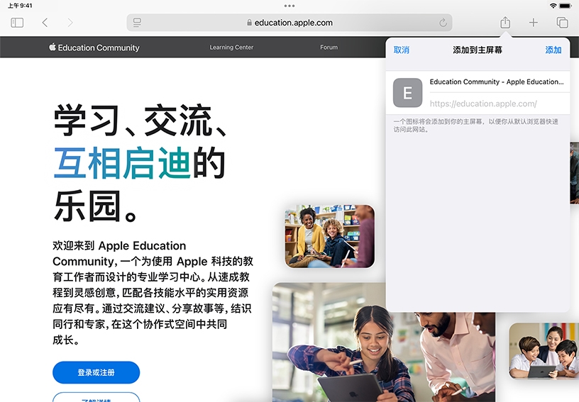 将 Apple Education Community 图标添加到主屏幕。轻点“共享”