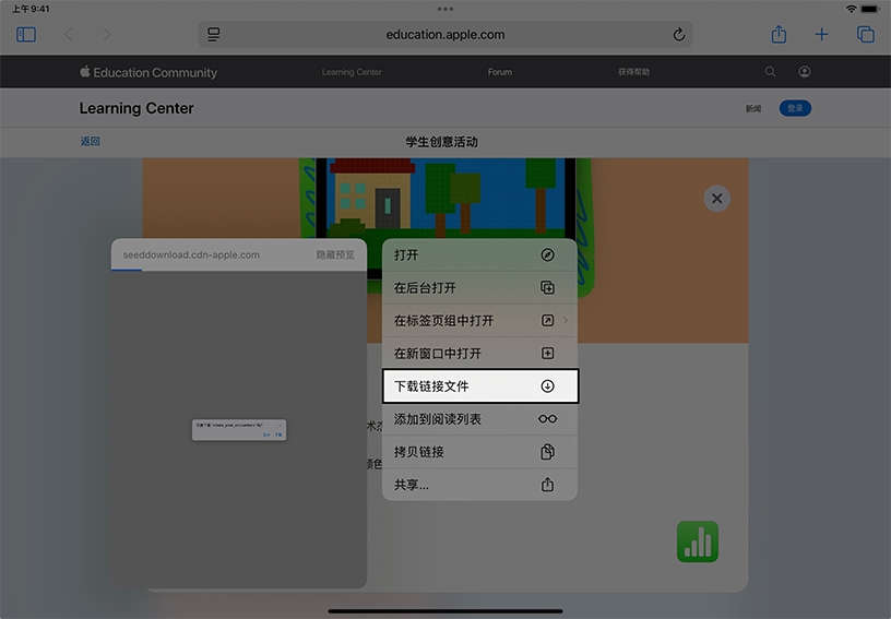 下载文件。轻触并按住网页上的链接,然后轻点“下载链接文件”。文件随即会在后台下载到你的 iPad。