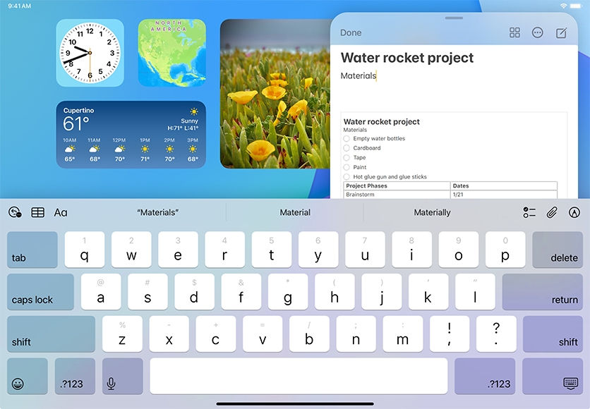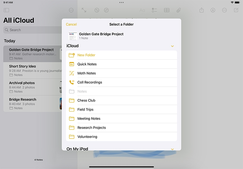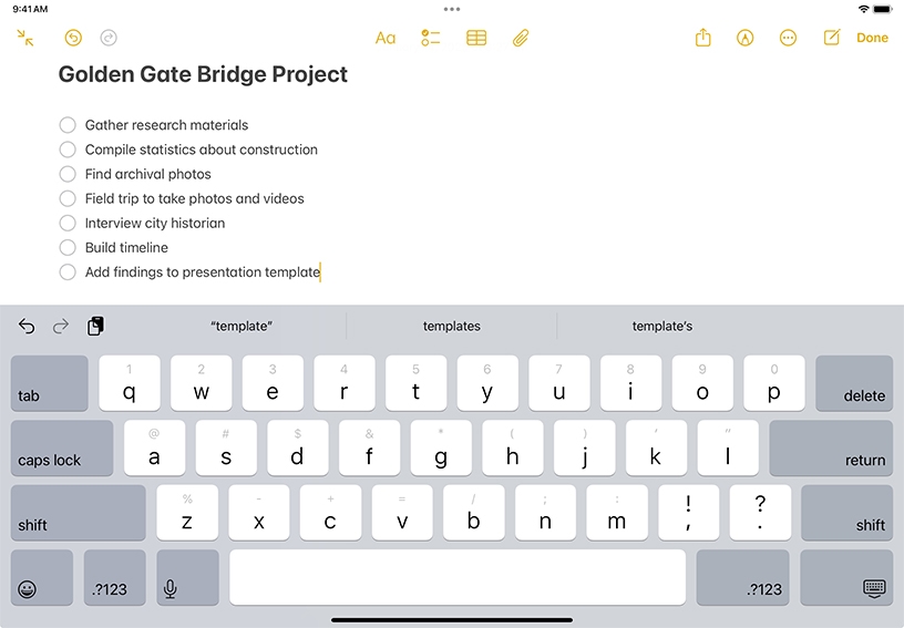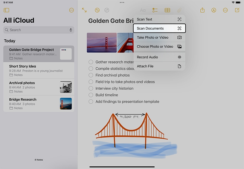 , then tap Scan Documents. Position iPad so that the document’s pages appears on the screen; iPad automatically captures the page. Scan additional pages, then tap Save when you’re done. The document is saved as a PDF in the note.