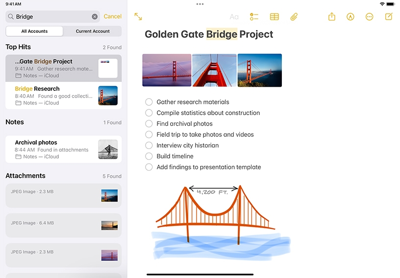 Search Notes. With the notes list visible, swipe down on the list, then tap the search field. You can search for typed or handwritten text, or use one of the search suggestions such as "Notes with Drawings.”