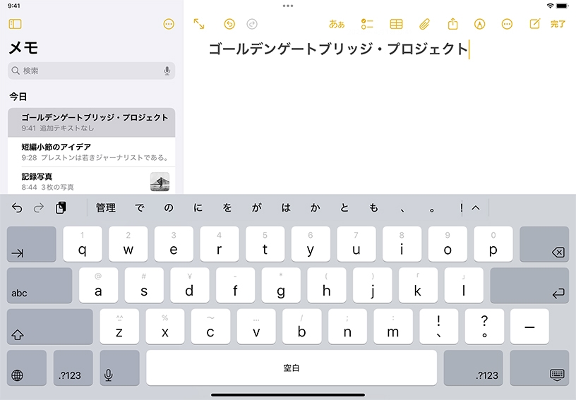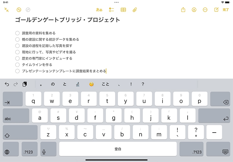 To Doリストを作ってみましょう。リストの最初の項目を入力してチェックリストボタンをタップし、Returnキーをタップして項目をさらに追加します。iPadを横向きに使っている場合、フルスクリーンボタン