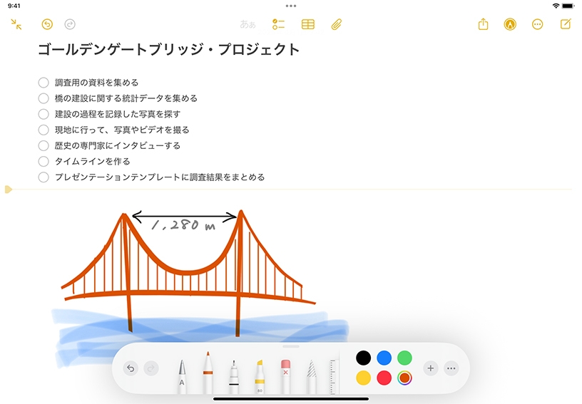 スケッチを描き加えてみましょう。メモにApple Pencilでスケッチを描いたり文字を書き込んだりします。指で描く場合は描画ボタンをタップします。