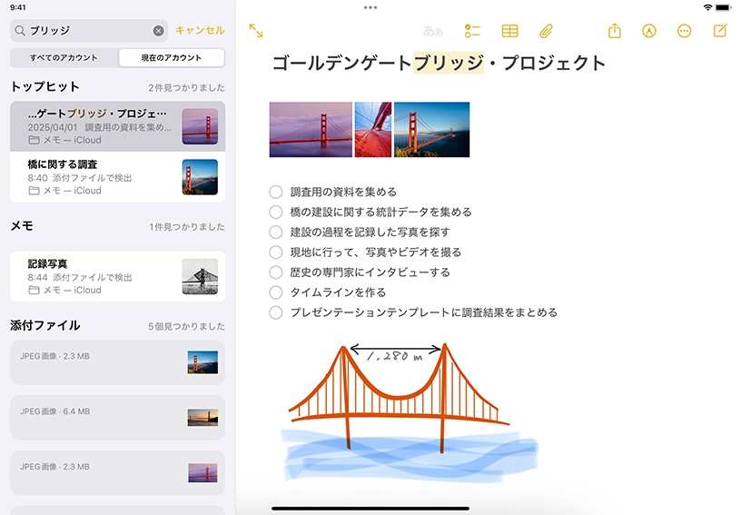 メモアプリは、思いついたことを書き留める、チェックリストを作る、アイデアをスケッチする、授業のための情報を整理するなど、様々な場面で使えます。画像やスケッチを追加したり、方程式を解いたり、チェックリストを作ったり。書類をスキャンすることもできます。さらにiCloudを使えば、どこにいる時でも、自分のすべてのデバイスで最新のメモを見ることができます。