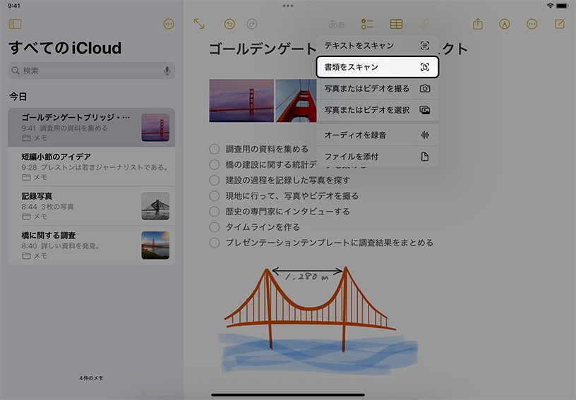 印刷物をスキャンしてみましょう。メモの中でクリップボタンをタップし、「書類をスキャン」を選択します。画面に書類のページが収まるようにiPadの位置を合わせると、そのページが自動的に取り込まれます。さらにページのスキャンを続け、終わったら「保存」をタップします。書類はPDFとしてメモに保存されます。