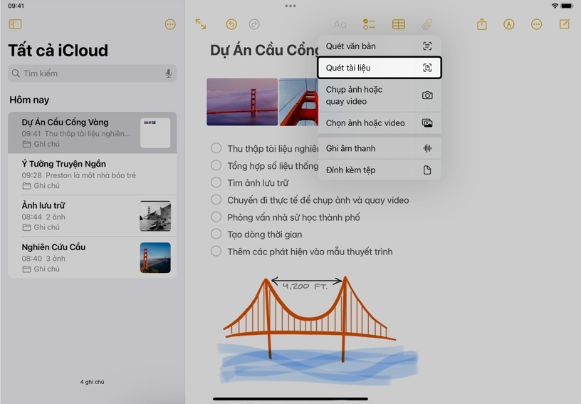 , sau đó chạm vào Quét Tài Liệu. Đặt iPad sao cho trang tài liệu xuất hiện trên màn hình; iPad sẽ tự động chụp trang. Quét các trang bổ sung, sau đó nhấn Lưu khi bạn thực hiện xong. Tài liệu được lưu dưới dạng PDF trong ghi chú.
