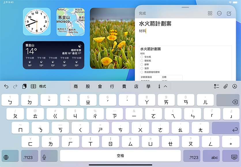 ,然後點一下「換行」以加入更多項目。橫向使用 iPad 時,你可以點一下「全螢幕」