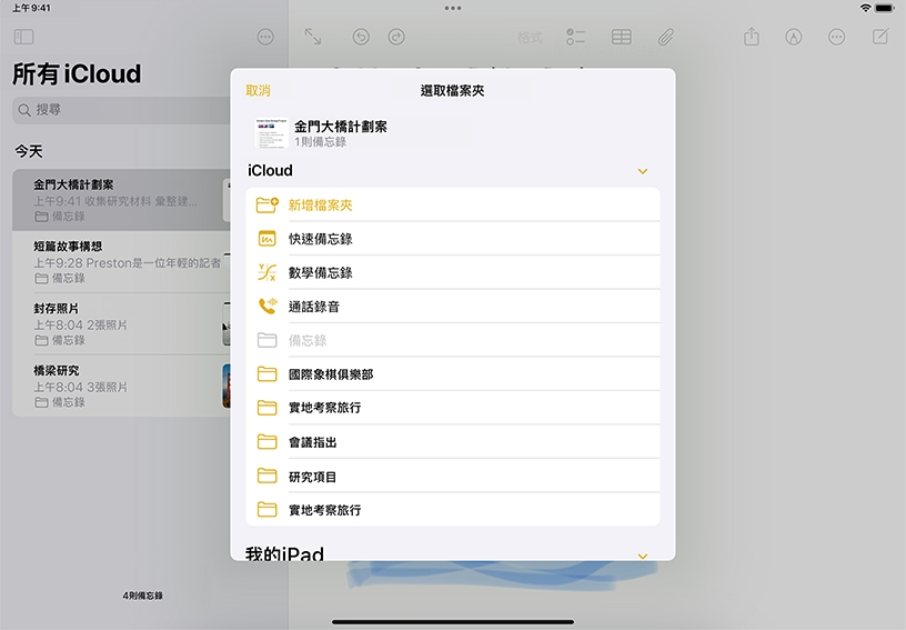 將備忘錄整理到檔案夾中。按住「備忘錄」列表中的備忘錄、點一下「搬移」、選擇帳號 (若擁有超過一個帳號)、點一下「新增檔案夾」,然後輸入名稱。