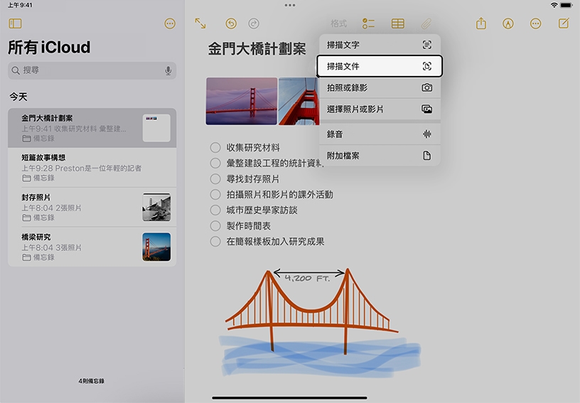 掃描紙本文件。在「備忘錄」中,點一下畫面頂端的迴紋針