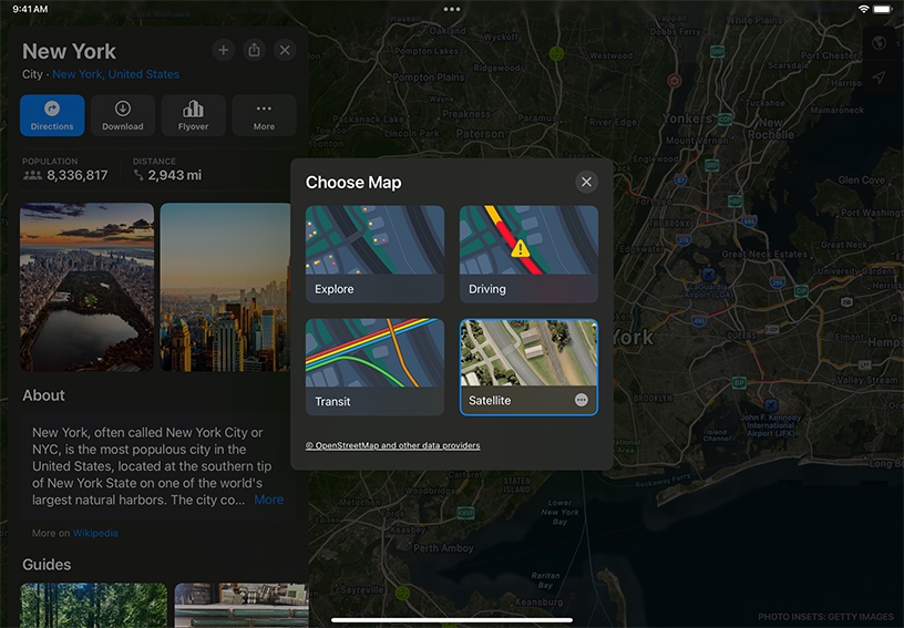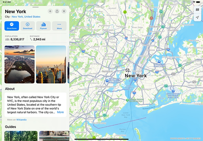 Search for a location. Open Maps, tap the search bar, and enter “New York, NY.” Tap Close to close the location card.