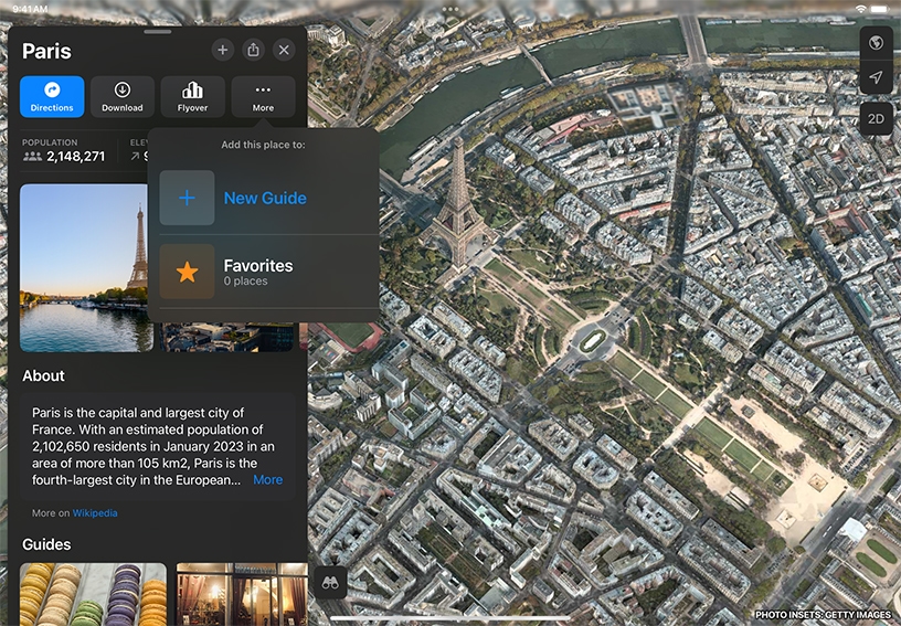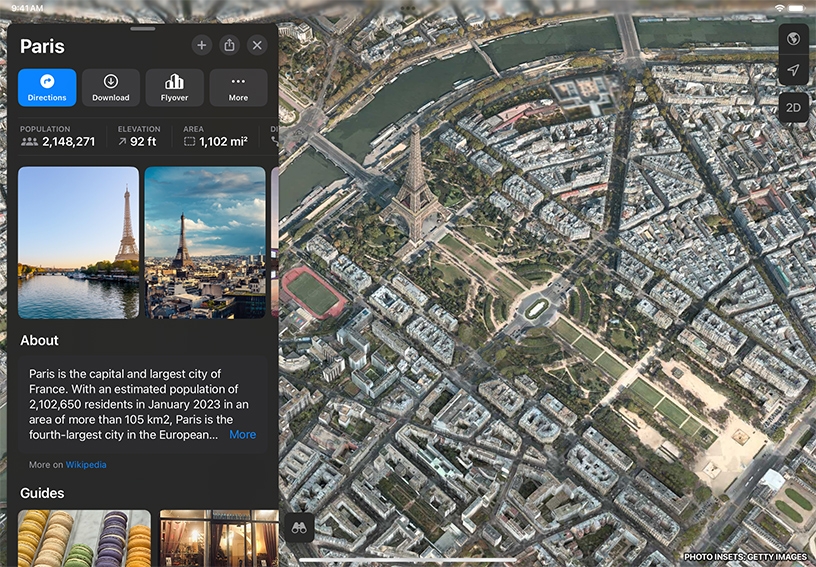 Watch a guided aerial 3D tour. Search for “Paris, France,” tap Flyover in the banner, then tap Start City Tour in the location card at the bottom of the screen. To end the tour, tap anywhere on the screen and tap Close on the card.