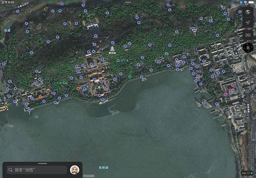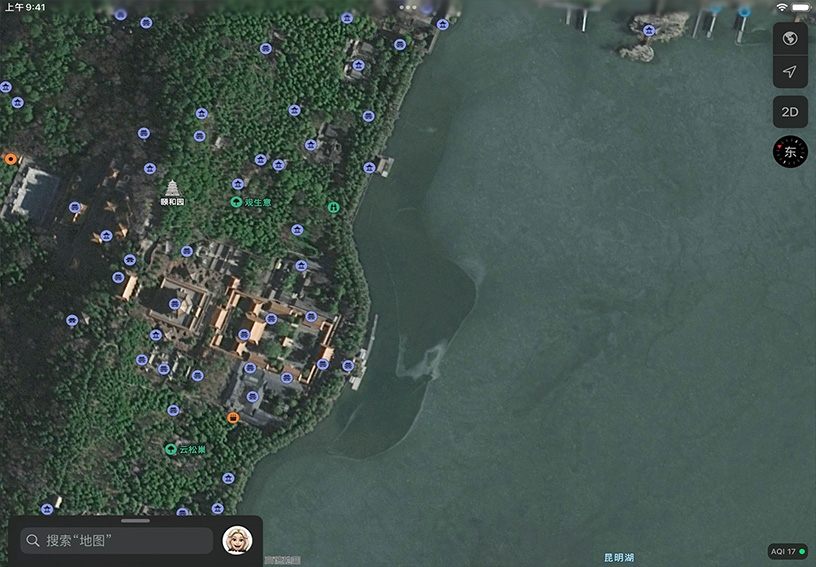 两指轻触屏幕,旋转地图透视图;上下拖移两指,能调整观察角度。