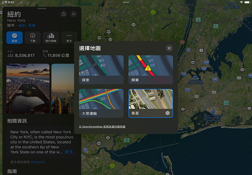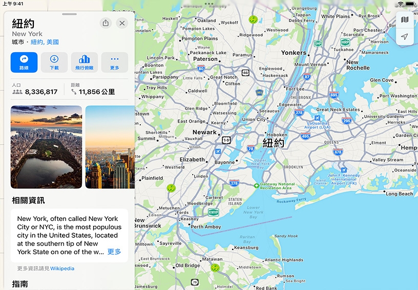 搜尋地點。打開「地圖」、點一下搜尋列,然後輸入「紐約」。點一下「關閉」
