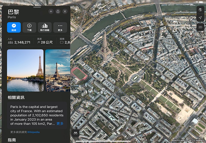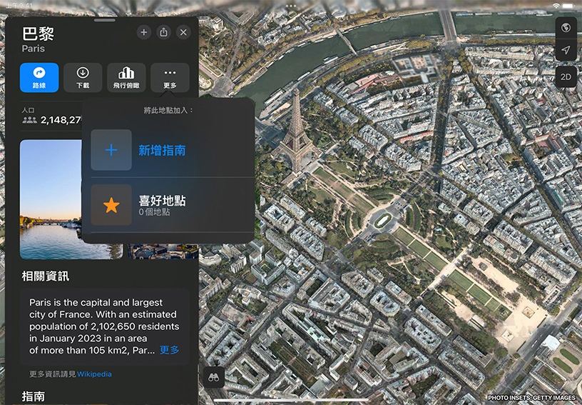 進行城市的步行導覽。尋找顯示 3D 的城市,點一下「飛行俯瞰」,然後在室內四處漫步,同時移動 iPad 並對準你想檢視的方向。