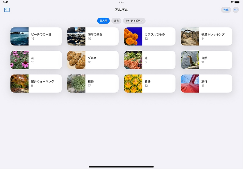 撮影した写真、ビデオ、スクリーンショットは、自動的に写真アプリに保存されます。校外学習などの行事ごとにアルバムを作成したり、日付、場所、カテゴリなどにもとづいて写真を検索したりすることができます。