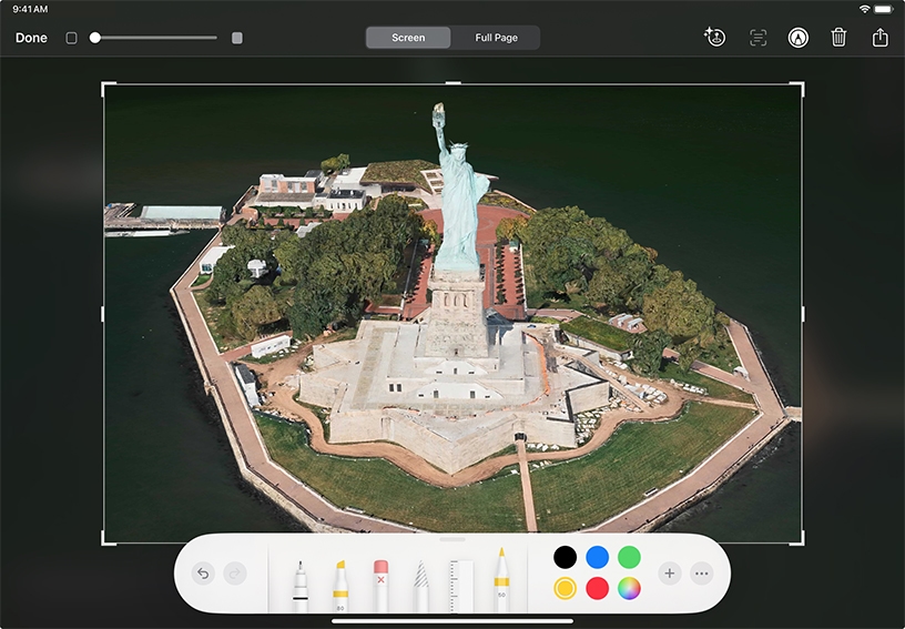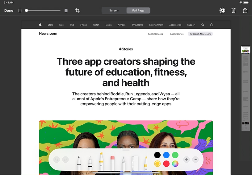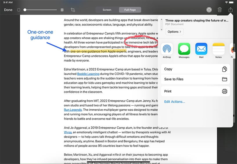 Create a full-page PDF. Take a screenshot of a webpage or Pages document containing multiple pages. Tap the screenshot thumbnail to open it. Tap Full Page, tap Done, then tap Save PDF to Files, choose a location, and tap Save. This captures the entire document — the full webpage, for example — not just the portion that was visible onscreen.