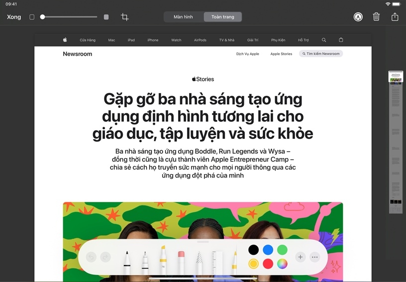 Tạo một tệp PDF của trang đầy đủ. Chụp ảnh màn hình của một trang web hoặc tài liệu Pages chứa nhiều trang. Chạm vào hình thu nhỏ của ảnh chụp màn hình để mở. Chạm vào Toàn Trang, chạm vào Xong, sau đó chạm vào Lưu PDF vào tệp, chọn vị trí và chạm vào Lưu. Thao tác này chụp toàn bộ tài liệu, chẳng hạn như toàn bộ trang web, không chỉ phần hiển thị trên màn hình.