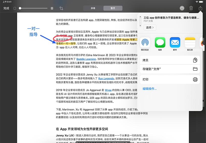 标注 PDF。使用标记工具,可在 PDF 的任意位置添加文本、高亮显示内容或添加其他注解。依次轻点“完成”和“存储到‘文件’”,选取存储位置,然后轻点“存储”。