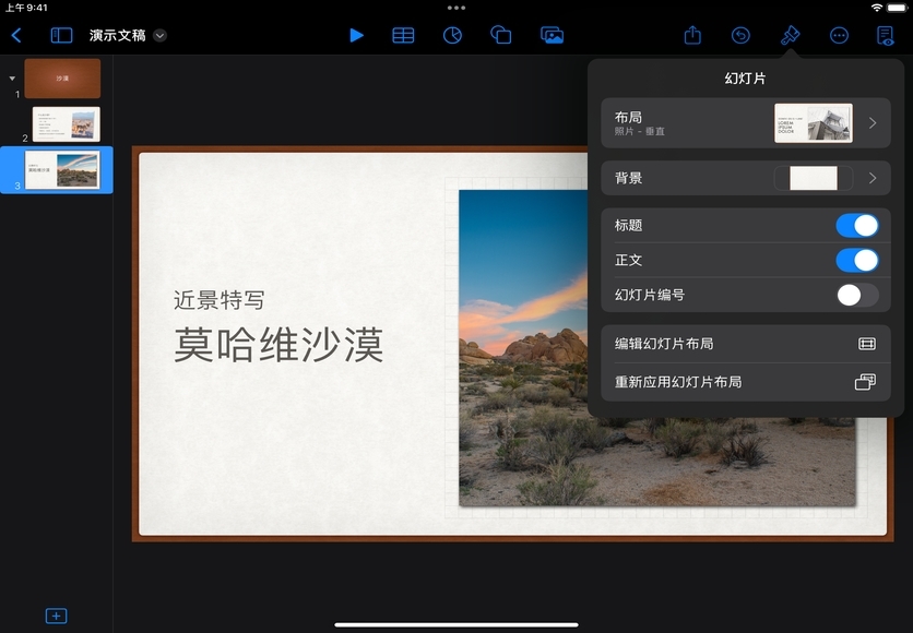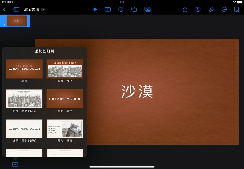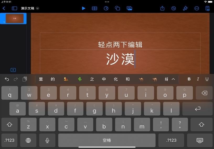 添加文本。轻点两下幻灯片上的占位符文本,然后输入自己的文字。完成后,轻点“隐藏键盘”
