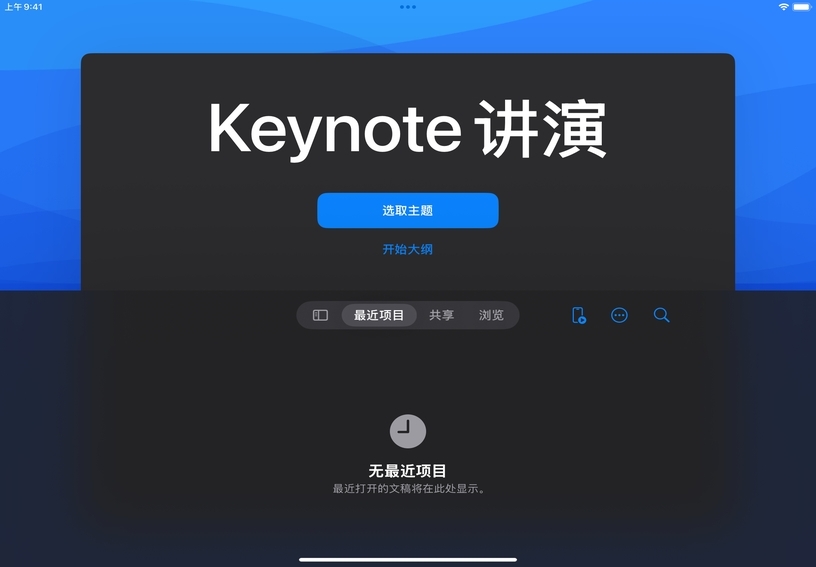 在演示文稿管理器中,轻点“选取主题”以打开主题选取器。