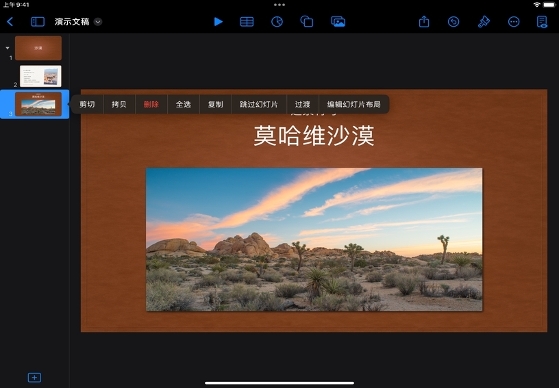 重新排列幻灯片顺序。轻触并按住幻灯片缩略图,待其呈现浮起状态后,将该幻灯片拖动至新位置。轻点幻灯片缩略图,可显示更多选项,如“删除”。