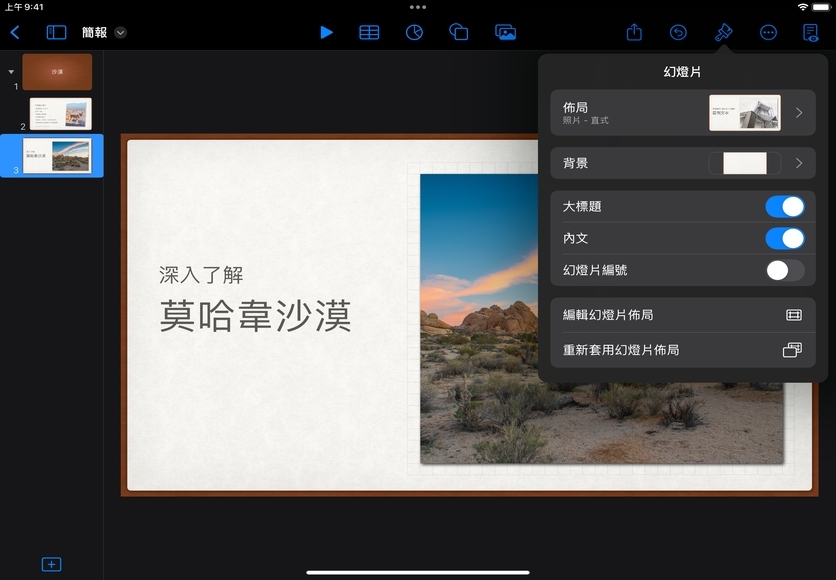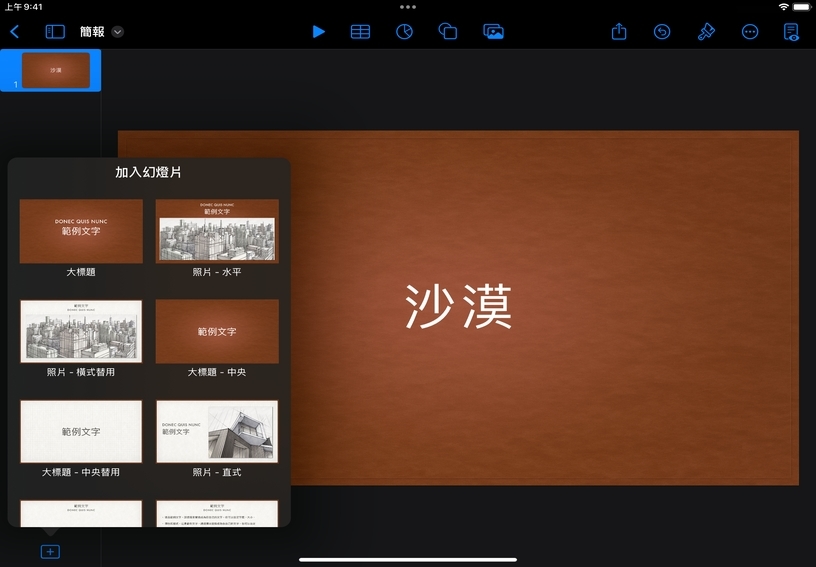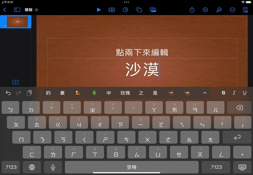 加入文字。點兩下幻燈片上的暫存區文字,然後自行輸入文字。完成時,點一下「隱藏鍵盤」