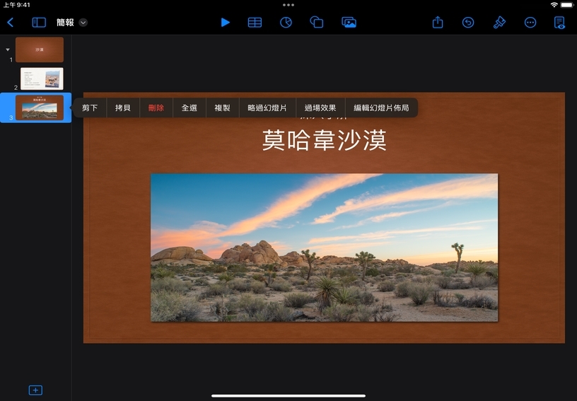 重新排列幻燈片。按住幻燈片縮覽圖直到它看似浮起來為止,然後將幻燈片拖移到新的位置。按一下幻燈片縮覽圖,查看更多選項,例如「刪除」。