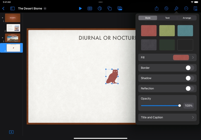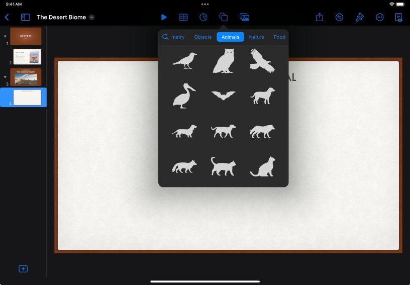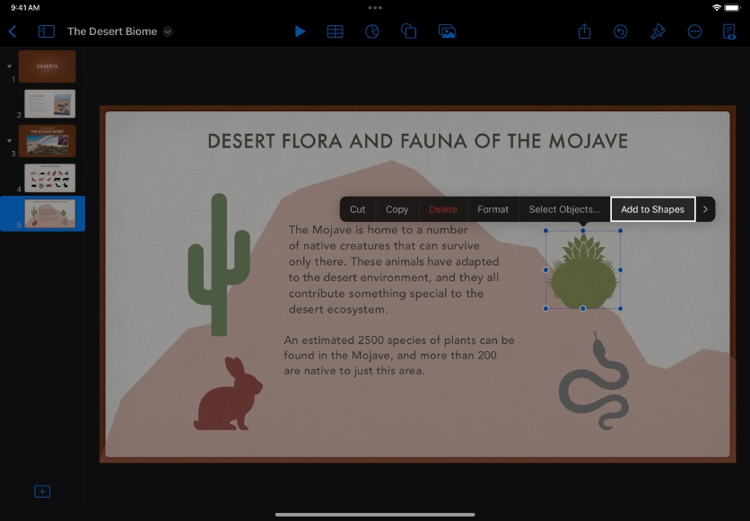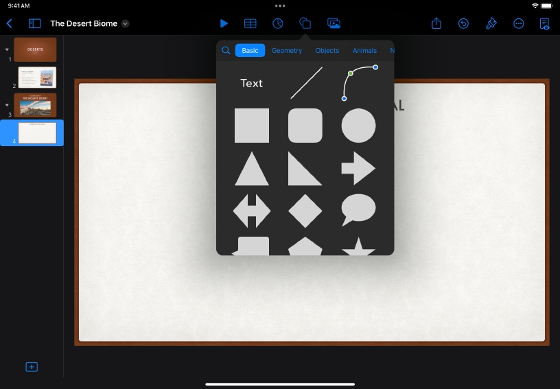 If you don’t find the shape you need in Keynote, you can make your own by combining or breaking apart existing shapes. After creating a custom shape, you can save it to your shapes library so you can use it in other projects