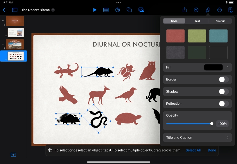 Format multiple shapes at once. Tap a shape, then choose Select Objects from the menu. Tap additional shapes to select them, then tap Done. Use the Format tools to change the look of all the selected shapes together.