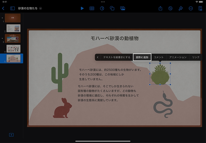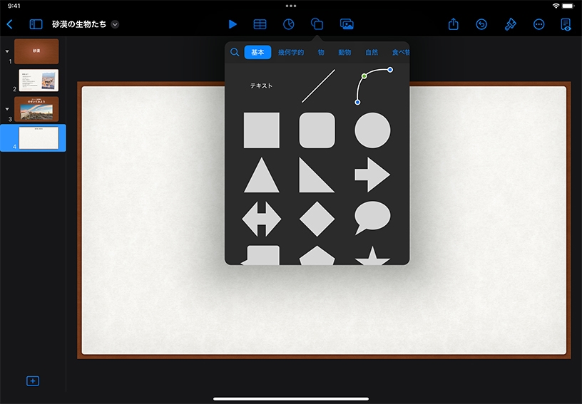 特定の図形を探すには、カテゴリを選択するか、検索をタップします。図形をタップするとスライドに追加されます。