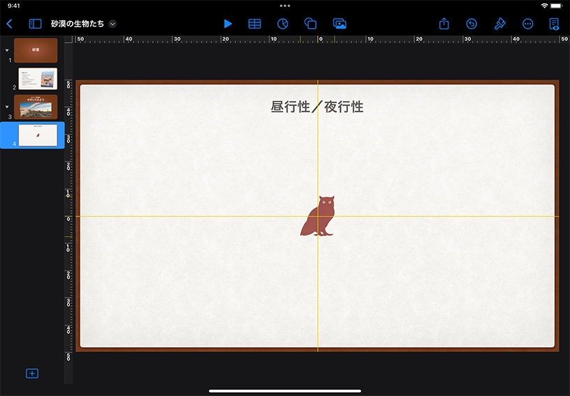 図形をドラッグして動かしてみましょう。黄色い配置ガイドが表示され、図形をスライドの中心に配置したり、スライド上のほかのオブジェクトとの位置関係を調整することができます。