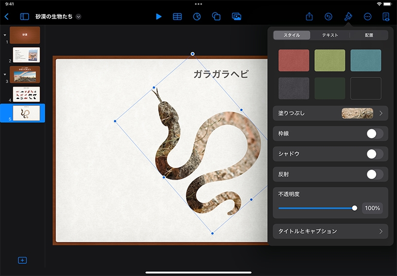 図形を画像で塗りつぶしてみましょう。スライド上の図形を選択し、フォーマットボタン>「スタイル」>「塗りつぶし」>「画像」>「画像を変更」の順にタップして、写真ライブラリから画像を選択してください。
