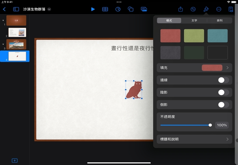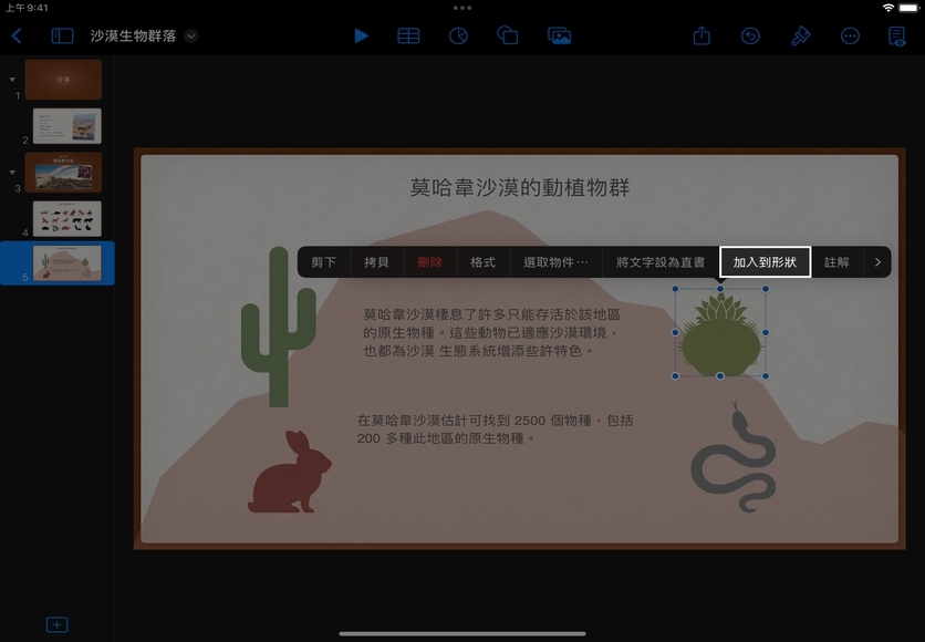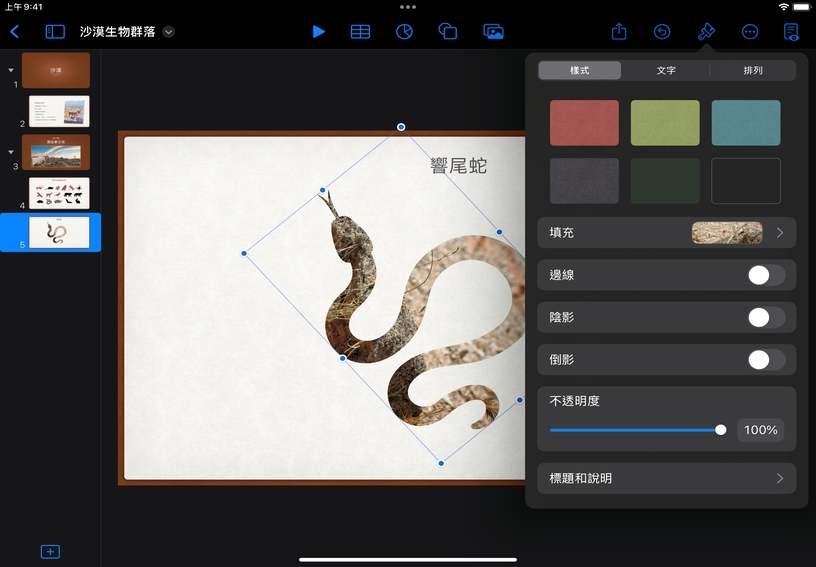 利用影像填充形狀。選取幻燈片中的形狀,然後點一下「格式」