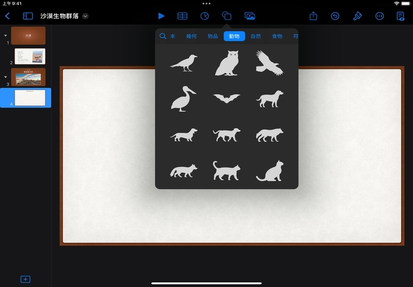 搜尋特定形狀。點一下形狀,將它加入幻燈片。