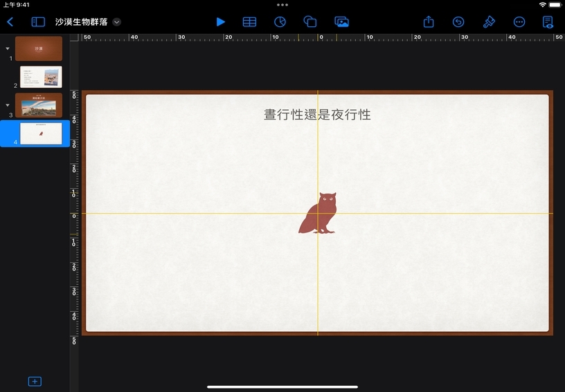 拖移形狀來移動。出現黃色的對齊參考線,以便將形狀置於幻燈片中央,或是以幻燈片上的其他物件為基準置中。